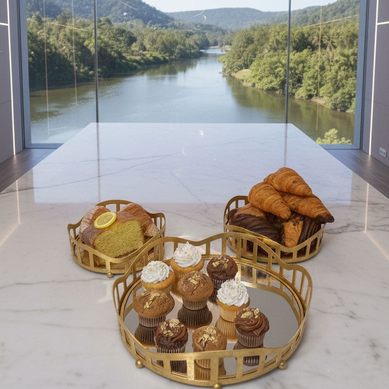 This luxurious set includes three round trays, perfectly sized for layering and various uses: